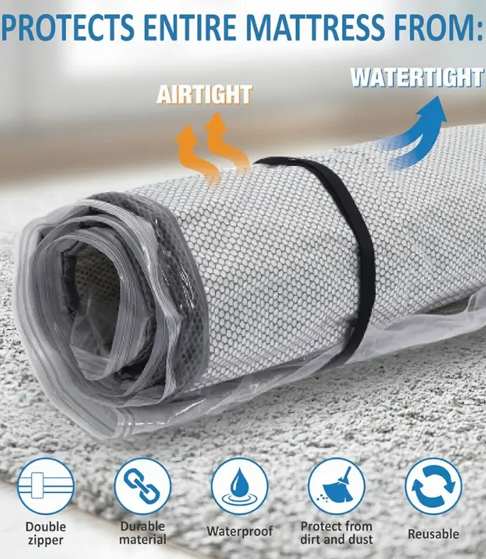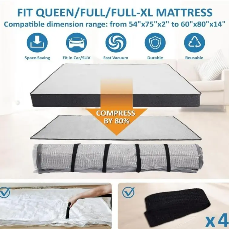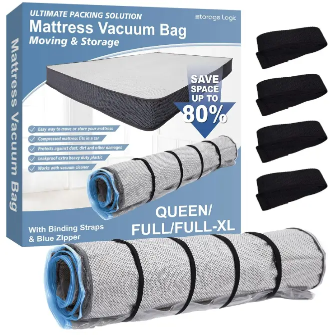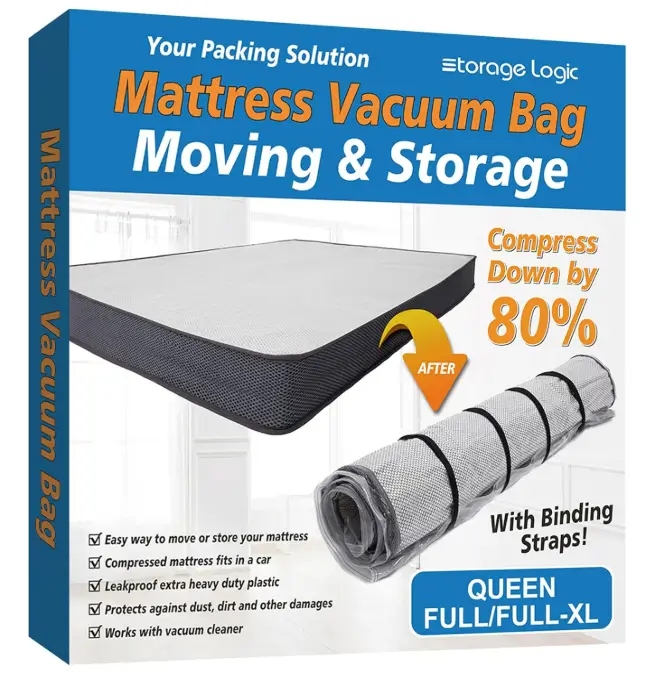 Overall, this product was very useful for sealing and protecting our queen mattress during a cross-country move. One of the biggest benefits was that it helped shield the mattress from bugs, dirt, and possible mold while it was stored and transported in a U-Haul U-Box for more than two weeks. We also loved that it compressed the mattress enough to make it much more compact, which helped us save valuable space. With some effort, we were even able to roll the mattress up, which made storage and transport even easier. We did need to use an extra strap to keep it tightly rolled, because the included straps were not strong enough to hold everything securely on their own. During our first attempt, we accidentally punctured the bag, so we ended up using a second vacuum bag that we had wisely purchased as a backup. In the end, using two bags actually worked out well because it gave the mattress extra protection and helped it stay compact during the move. It is worth knowing that the plastic can puncture fairly easily, so you really have to handle it with care throughout the process. Vacuuming the mattress also takes some time and patience, but the final result is worth the effort. Overall, this is a very helpful product for moving and storing a mattress, as long as you are prepared to use stronger straps and be careful not to damage the bag