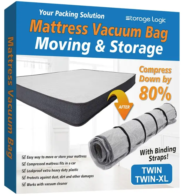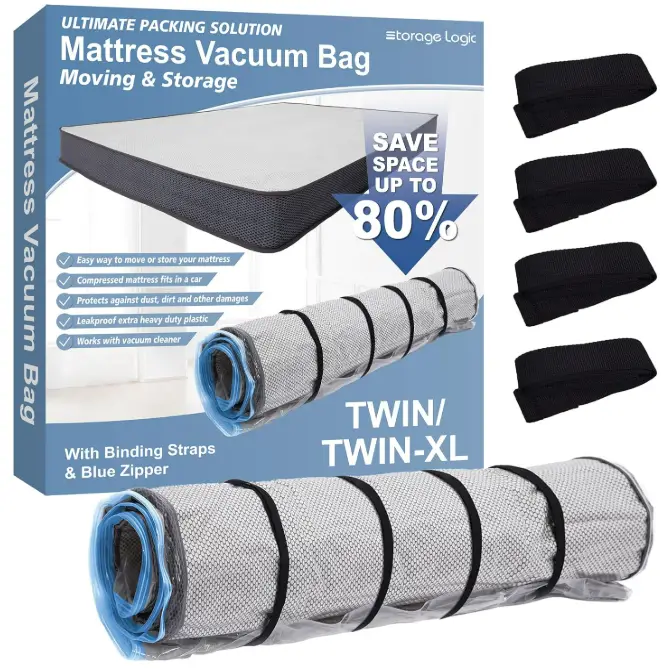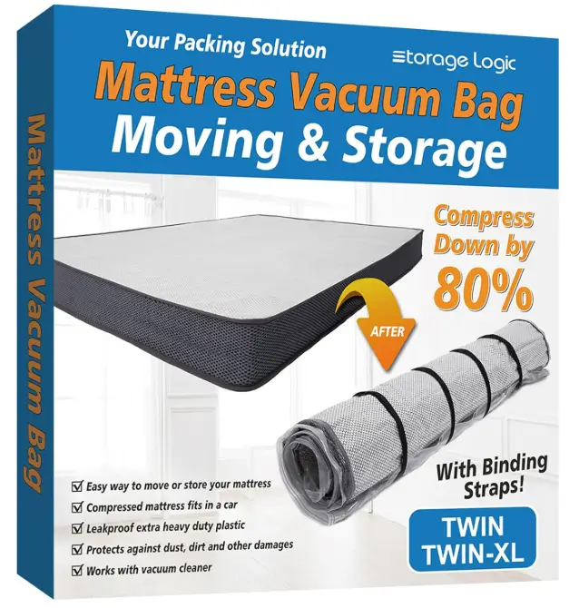 The Storage Logic Foam Mattress Vacuum Bag for Twin and Twin XL mattresses helps compress bulky foam mattresses, making them easier to move, store, or ship with less effort. It includes 4 adjustable packing straps to keep the mattress secure after vacuum sealing, which is especially useful when carrying it or fitting it into tighter spaces. This bag also helps protect the mattress from dust, dirt, and handling during transport, giving buyers a cleaner and more organized storage solution