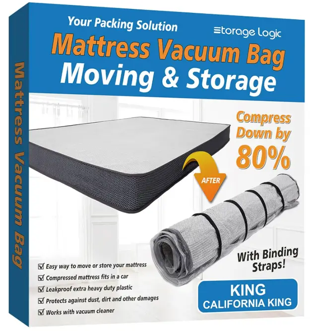 The Storage Logic Foam Mattress Vacuum Bag for King and Cal-King mattresses is designed to make large, bulky mattresses much easier to move, store, or ship. With 4 adjustable packing straps included, it helps keep the compressed mattress tightly secured so it takes up less space and is easier to handle. It is a practical choice for protecting your mattress from dust and dirt while giving you a more manageable way to transport or store oversized beds